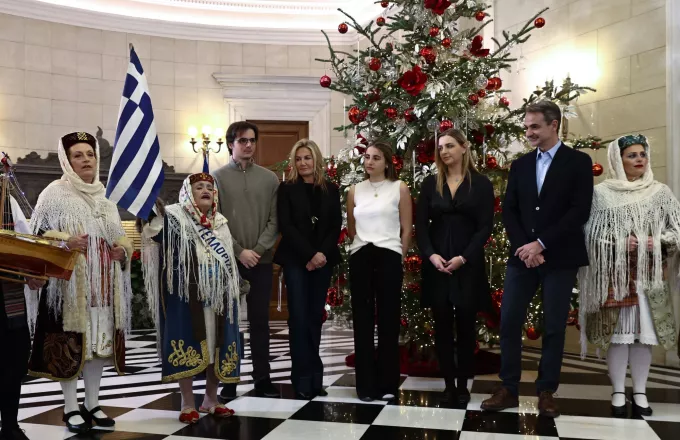 Οπρωθυπουργός Κυριάκος Μητσοτάκης μαζί με τη σύζυγό του Μαρέβα και τα τρία τους παιδιά Κωνσταντίνο, Σοφία και Δάφνη άκουσαν σήμερα στο Μέγαρο Μαξίμου κάλαντα και μαντινάδες από το Καστελόριζο.