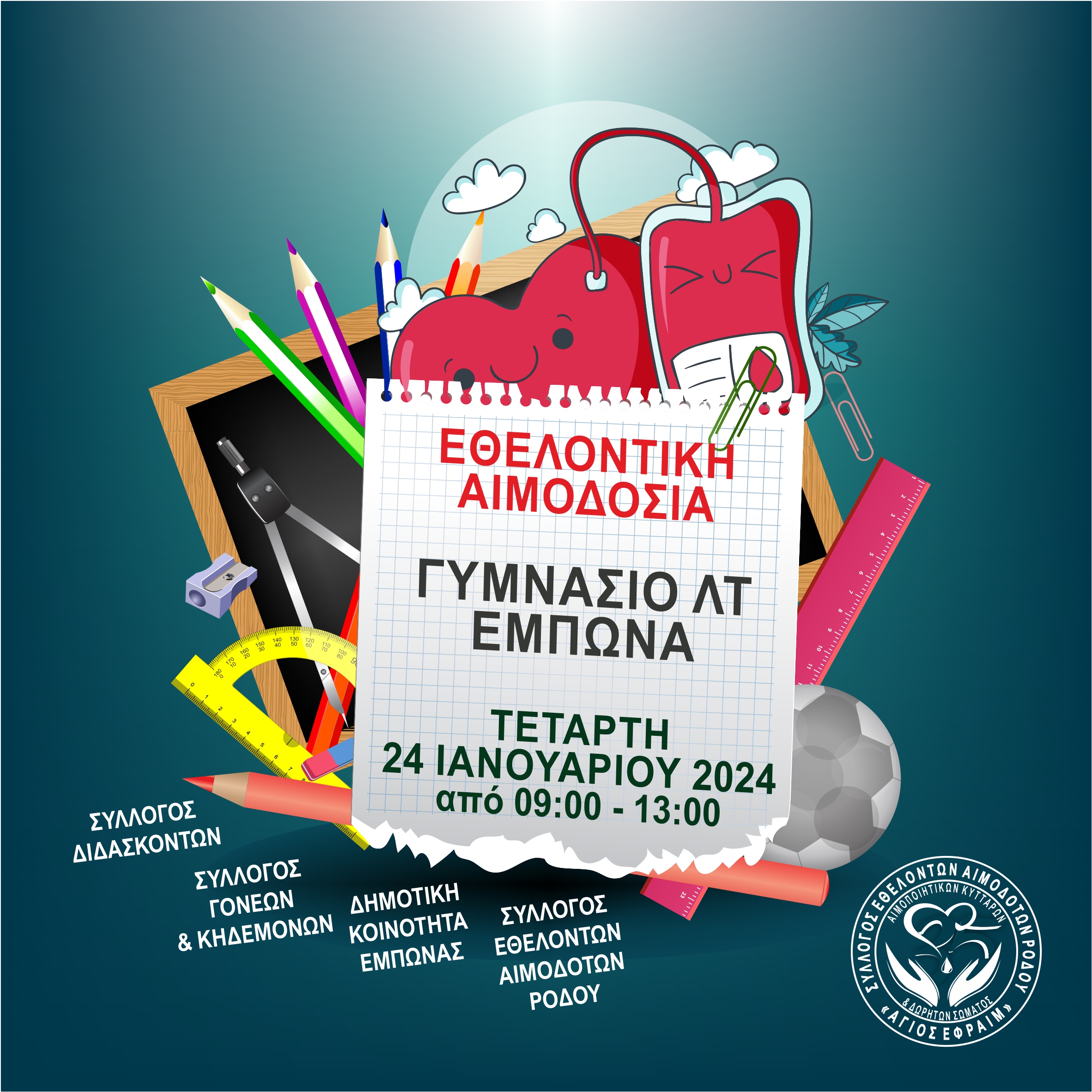 Σε μια συντονισμένη προσπάθεια για την ενίσχυση των αποθεμάτων αίματος στο νησί μας, το Γυμνάσιο με τις Λυκειακές Τάξεις Έμπωνα, ο Σύλλογος Διδασκόντων, ο Σύλλογος Γονέων και Κηδεμόνων, η Δημοτική Κοινότητα Έμπωνας και ο Σύλλογος Εθελοντών Αιμοδοτών Ρόδου, συνεργάζονται για μια μεγάλη εθελοντική αιμοδοσία.