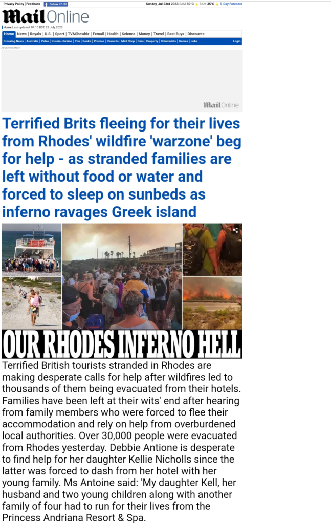 Τρομοκρατημένοι Βρετανοί που φεύγουν για να σώσουν τη ζωή τους από την «εμπόλεμη ζώνη» της δασικής πυρκαγιάς της Ρόδου εκλιπαρούν για βοήθεια – καθώς οι εγκλωβισμένες οικογένειες μένουν χωρίς φαγητό ή νερό και αναγκάζονται να κοιμούνται σε ξαπλώστρες καθώς η κόλαση καταστρέφει το ελληνικό νησί