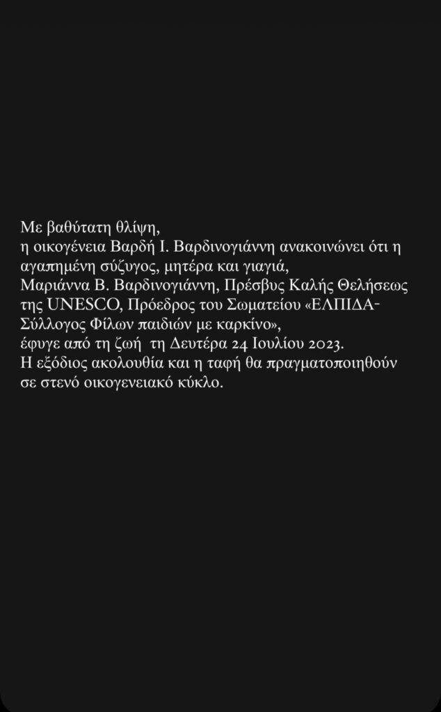 Την τελευταία της πνοή σε ηλικία 80 ετών άφησε η Μαριάννα Β. Βαρδινογιάννη.