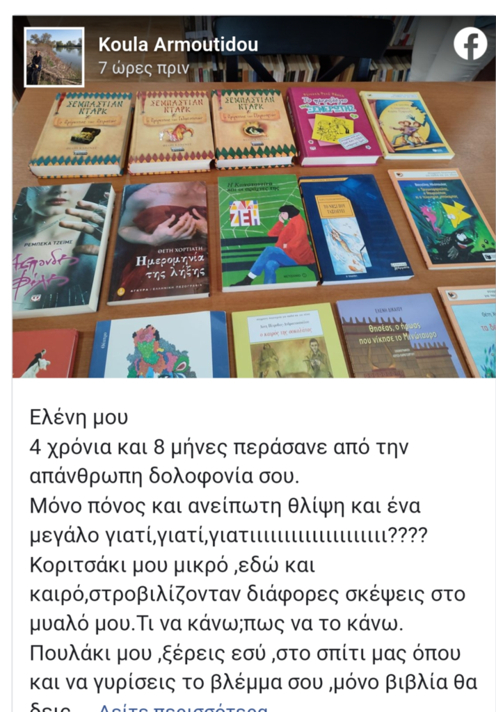 Κοριτσάκι μου μικρό, εδώ και καιρό στροβιλίζονταν διάφορες σκέψεις στο μυαλό μου. Τι να κάνω; Πώς να το κάνω; Πουλάκι μου, ξέρεις εσύ, στο σπίτι μας, όπου και να γυρίσεις το βλέμμα σου, μόνο βιβλία θα δεις. Σκέφτηκα λοιπόν να κάνω μια δωρεά στη δανειστική βιβλιοθήκη Διδυμοτείχου, κάποια από τα βιβλία σου. Όλα γράφουν το όνομά σου. Ξέρω ότι αν ζούσες θα το χαιρόσουν πολύ και θα το ευχαριστιόσουν. Σήμερα το πρωί τα χάρισα.