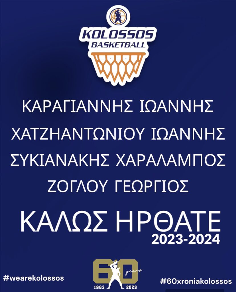 Ο Α.Ο. Κολοσσός βρίσκεται στην ευχάριστη θέση να ανακοινώσει την απόκτηση τεσσάρων νεαρών και ταλαντούχων αθλητών για τα τμήματα υποδομής του. Πρόκειται για τον Γιάννη Καραγιάννη, τον Γιάννη Χατζηαντωνίου, τον Χαράλαμπο Συκιανάκη και τον Γιώργο Ζόγλου.