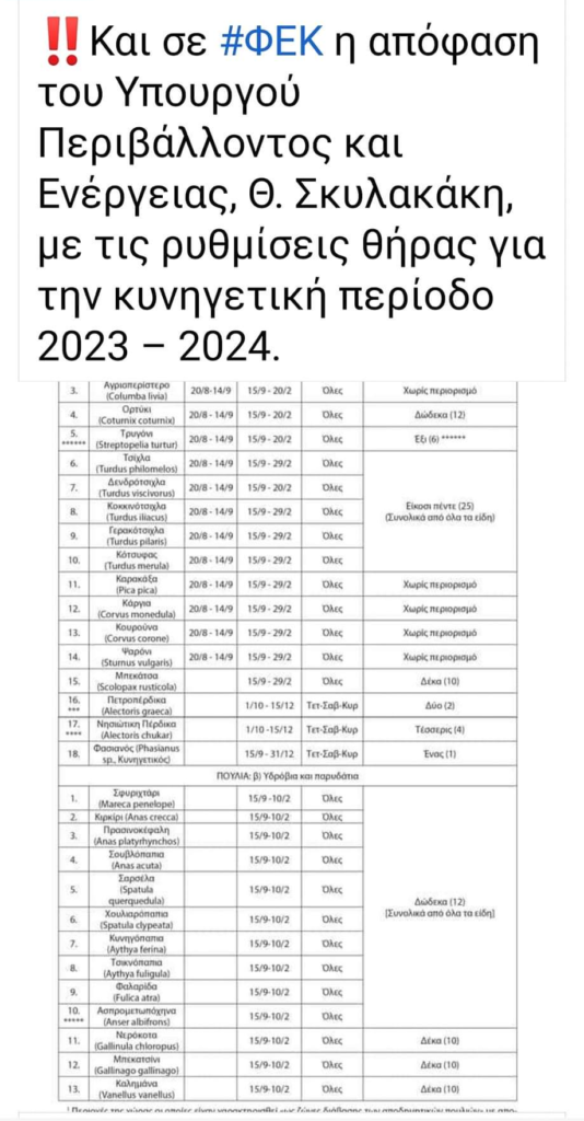 Παρακαλούνται όλοι οι κυνηγοί να απευθύνονται στα γραφεία των Συλλόγων τους.