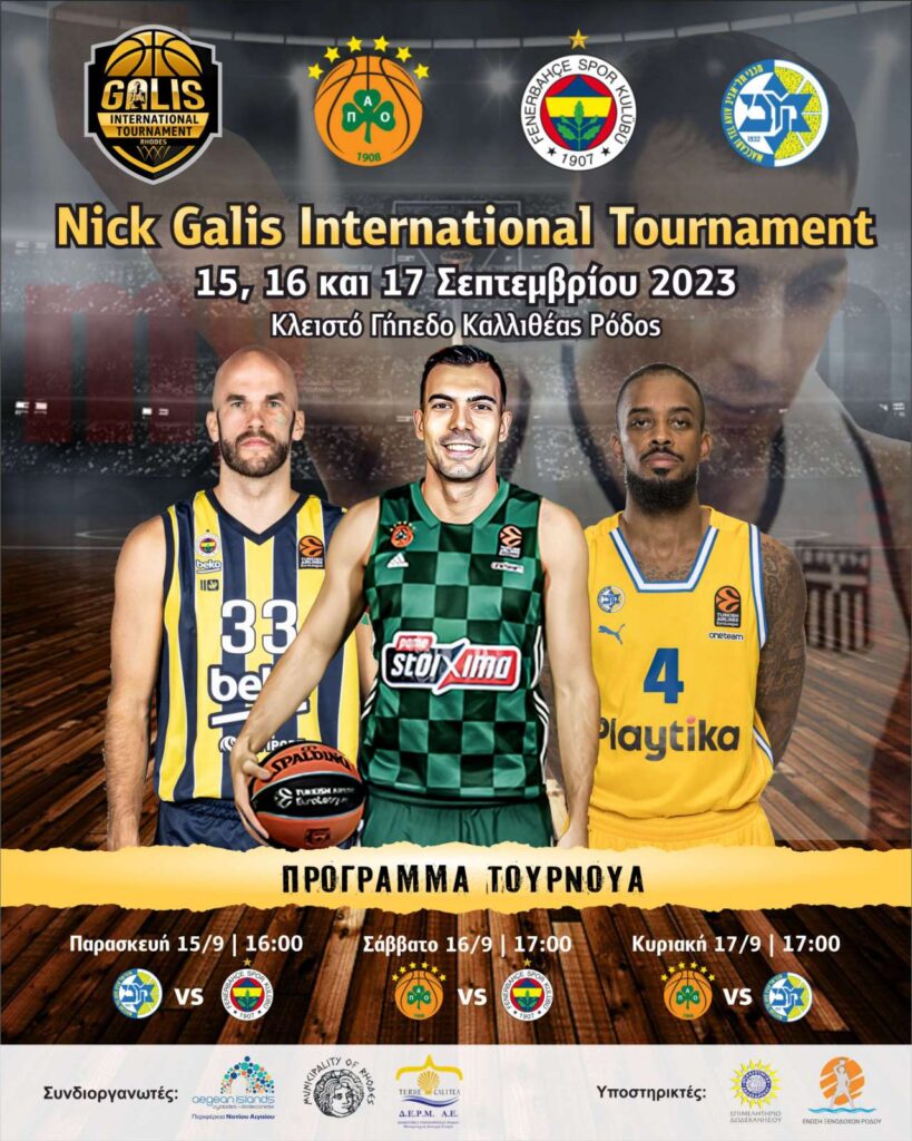 Το πιο μεγάλο αθλητικό γεγονός στη Ρόδο είναι γεγονός… Από 15 έως 17 Σεπτεμβρίου θα διεξαχθεί στο Παλέ ντε Σπορ της Καλλιθέας το Nick Galis International Tournament, με τη συμμετοχή του Παναθηναϊκού, της Φενερμπαχτσέ και της Μακάμπι Τελ Αβίβ. Το τουρνουά διοργανώνει η Galis Basketball Events, συνδιοργανωτές είναι η Περιφέρεια Νοτίου Αιγαίου, ο Δήμος Ρόδου και η Δ.Ε.Ρ.Μ.Α.Ε. και υποστηρικτές το Επιμελητήριο Δωδεκανήσου και η Ένωση Ξενοδόχων Ρόδου.