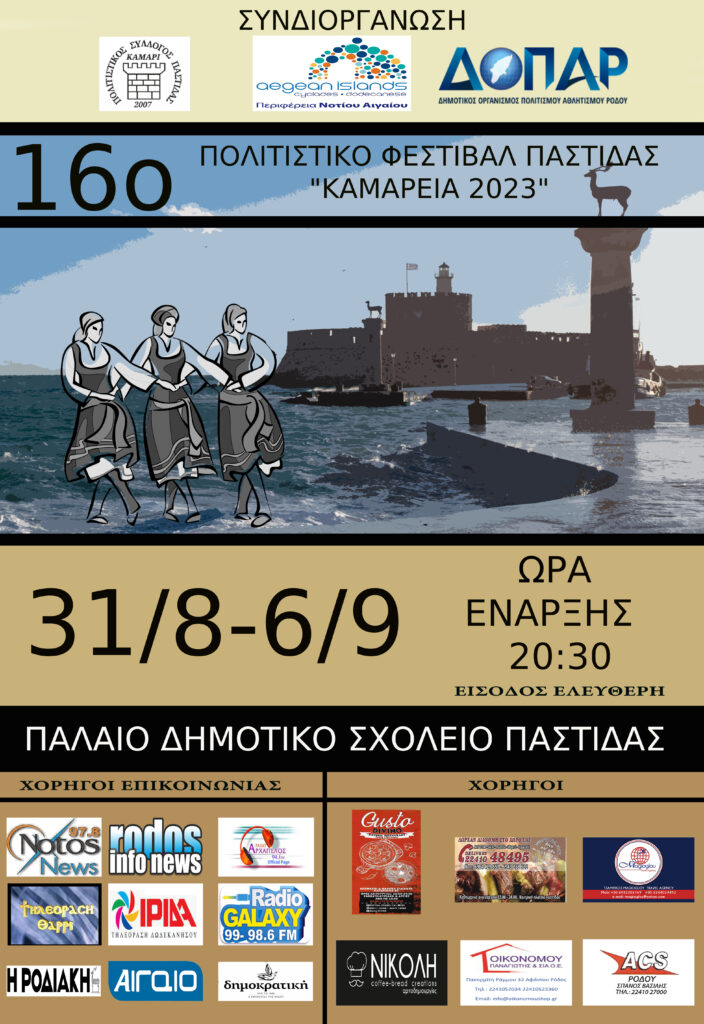 Ο Πολιτιστικός Σύλλογος Παστίδας Ρόδου «Καμάρι» σας προσκαλεί στο 16ο Πολιτιστικό Φεστιβάλ Παστίδας «Καμάρεια 2023» που συνδιοργανώνει με την Περιφέρεια Νοτίου Αιγαίου και τον Δ.Ο.Π.Α.Ρ.