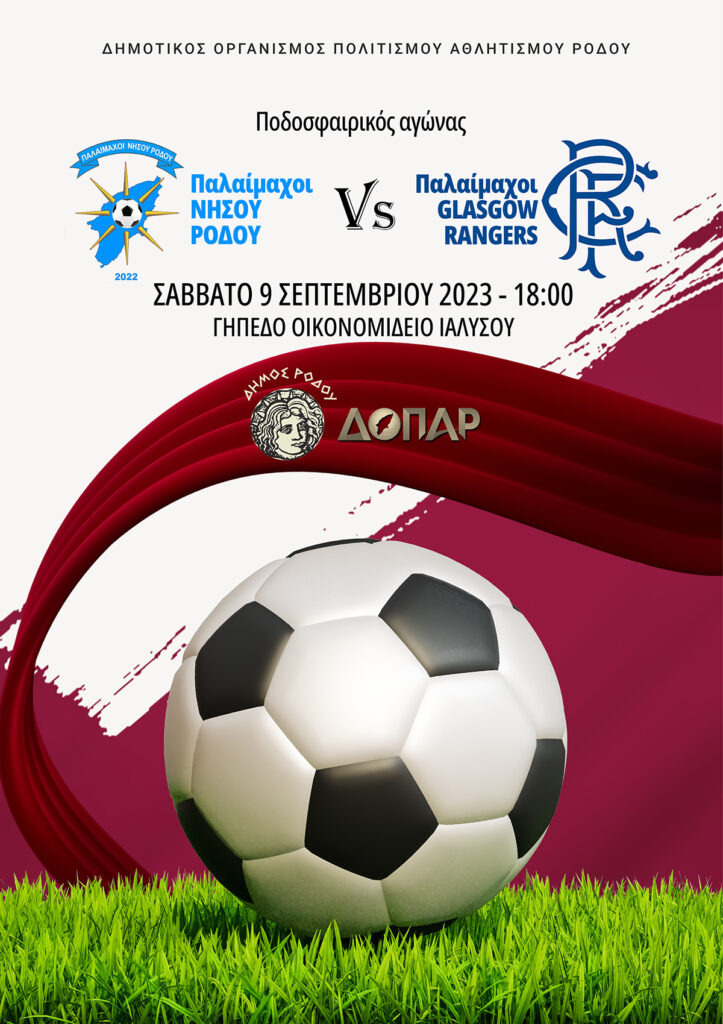 Ο Δήμαρχος Ρόδου Αντώνης Β. Καμπουράκης και ο Πρόεδρος του ΔΟΠΑΡ Τέρης Χατζηιωάννου, σας προσκαλούν στον Φιλικό ποδοσφαιρικό αγώνα Παλαιμάχων Νήσου Ρόδου – Ρέιντζερς Γλασκώβης που θα πραγματοποιηθεί το προσεχές Σάββατο 9 Σεπτεμβρίου στις 6.00 μ.μ., στο Γήπεδο Ιαλυσού.