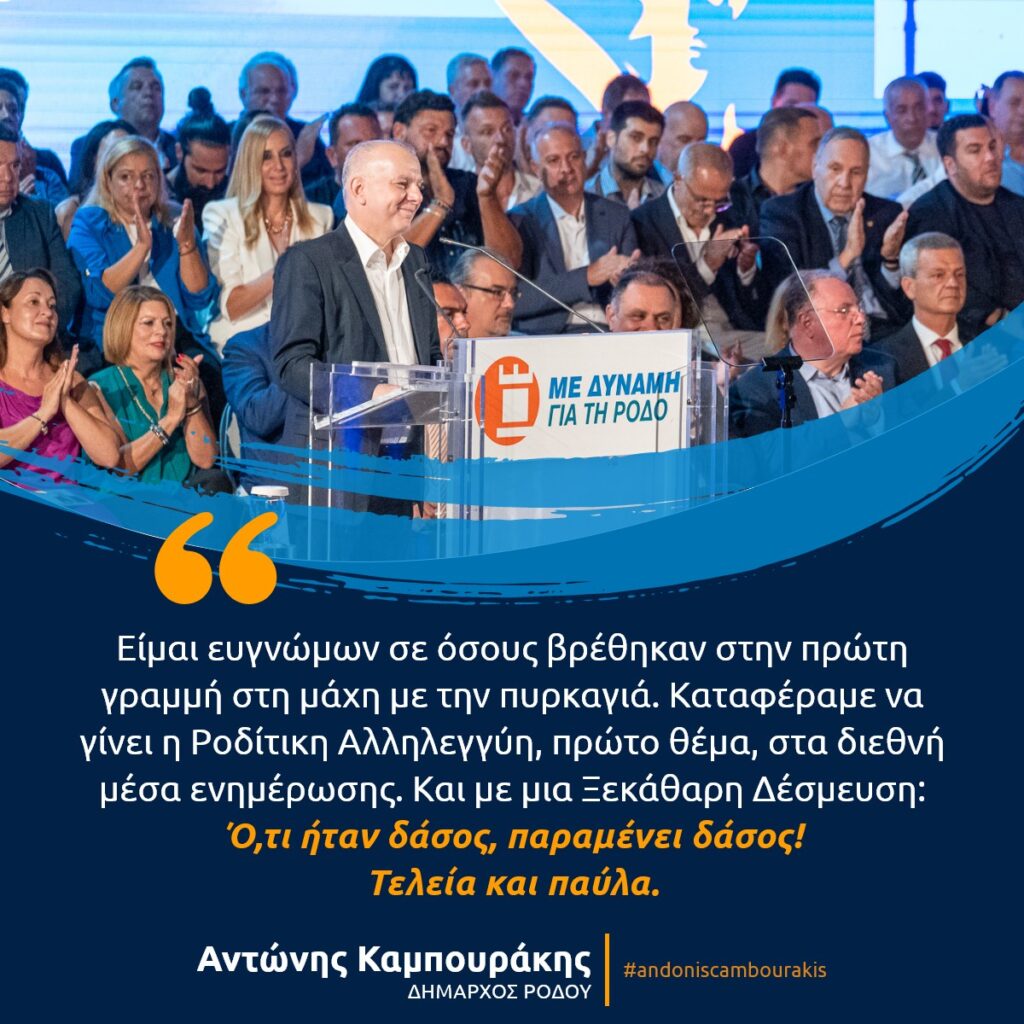 Σε αυτή την τραγωδία, ήμασταν όλοι μας, Στελέχη & Εργαζόμενοι του Δήμου, στην Πρώτη Γραμμή. Και με τη δική μας συμβολή, πραγματοποιήθηκε το τεράστιο έργο των εκκενώσεων, η περίθαλψη των πληγέντων, η φροντίδα των ζώων του νησιού μας, μαζί πάντα με τους συμπολίτες μας, που μας έκαναν περήφανους: Δείχνοντας το Καλό Πρόσωπο της Ρόδου, σε όλο τον κόσμο! Και στους οποίους, είμαι Πάντα ευγνώμων.