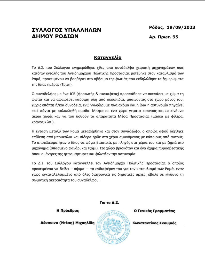 Το Δ.Σ. του Συλλόγου καταγγέλλει τον Αντιδήμαρχο Πολιτικής Προστασίας ο οποίος προκειμένου να δείξει – όψιμα – το ενδιαφέρον του για τον καταυλισμό των Ρομά, έναν χώρο εγκαταλελειμμένο από όλες διαχρονικά τις δημοτικές αρχές, έβαλε σε κίνδυνο τη σωματική ακεραιότητα του συναδέλφου.