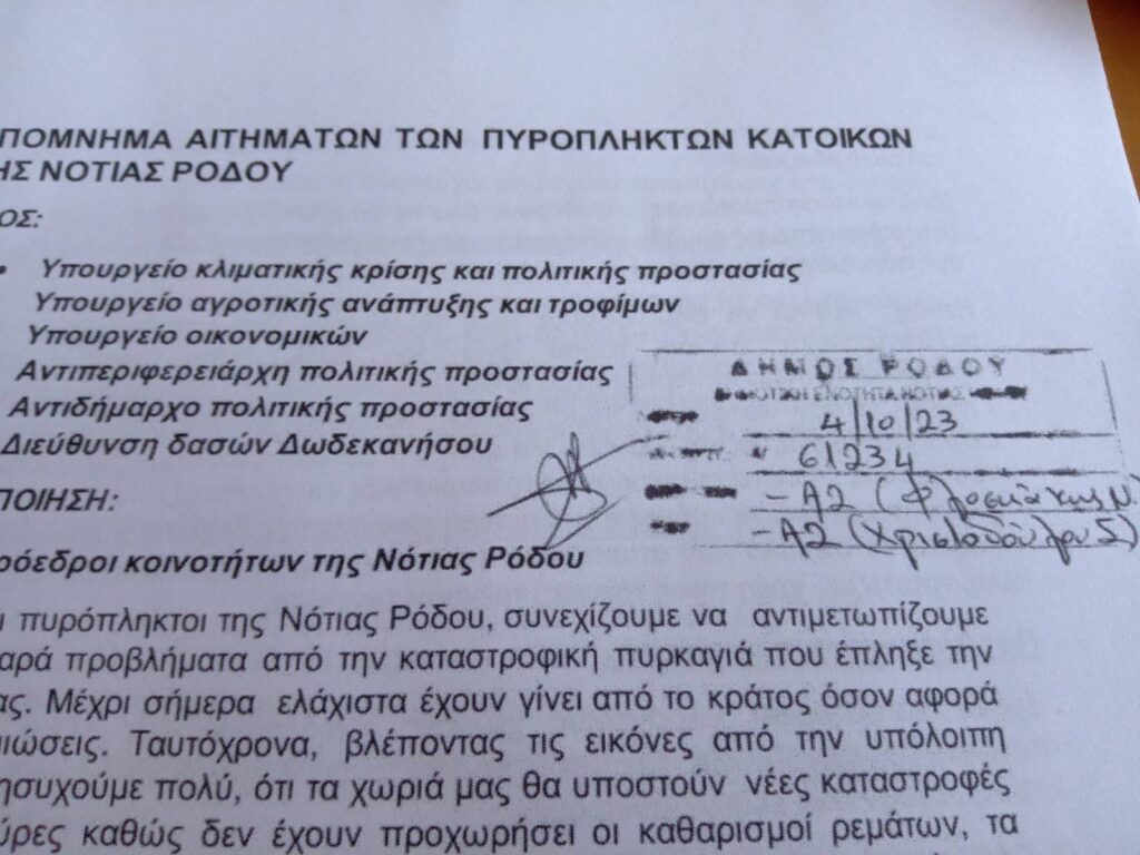 Την Τετάρτη 4/10 πυρόπληκτοι της Νότιας Ρόδου , καταθέσαμε υπόμνημα αιτημάτων, στο δημαρχείο στο Γεννάδι, με παραλήπτη κάθε αρμόδιο.