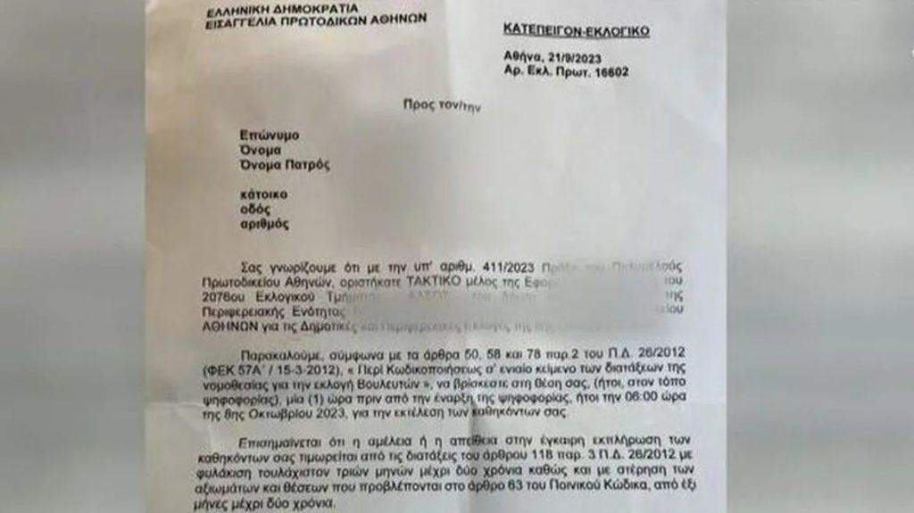 Σύμφωνα με πληροφορίες, εστάλη μία επιστολή από την Εισαγγελία Πρωτοδικών, σε μία οικογένεια, η οποία ενημερώνει ότι ένας άνθρωπος, ο οποίος έχει φύγει από τη ζωή εδώ και περισσότερο από είκοσι χρόνια, ορίστηκε ως μέλος της εφορευτικής επιτροπής σε εκλογικό κέντρο της περιοχής που διέμενε.