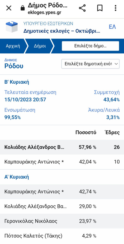 Ο κ. Κολιάδης συγκέντρωσε 25.571 ψήφους και ποσοστό 57,96%, ενώ ο κ. Καμπουράκης συγκέντρωσε 18.548 ψήφους και ποσοστό 42,07%.
