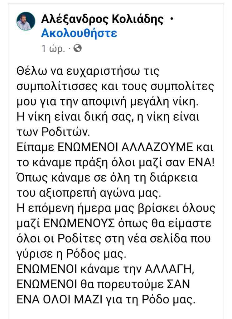 Η Ρόδος έχει νέο δήμαρχο. Τα αποτελέσματα στις εκλογές έδωσαν το έναυσμα στον ίδιο και στους στενούς συνεργάτες του, να ξεσπάσουν σε πανηγυρισμούς