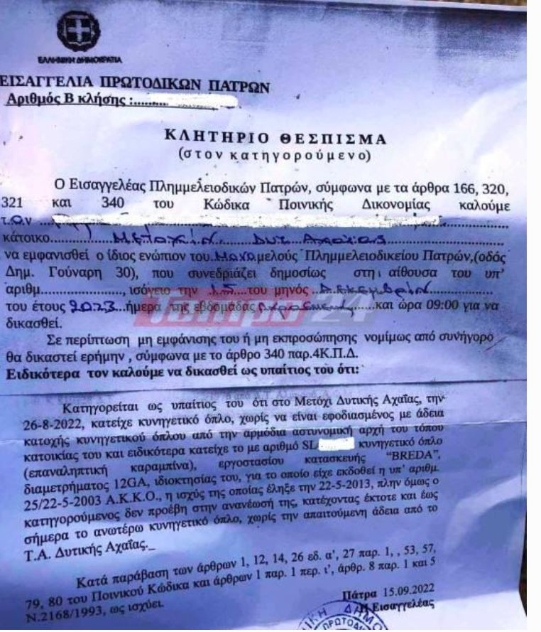 Ο γιος του έλαβε προ ημερών, το έγγραφο που το Δικαστήριο τον καλεί στο εδώλιο, καθώς δεν ανανέωσε την άδεια κυνηγετικής καραμπίνας που κατείχε.