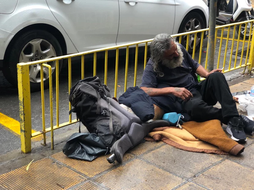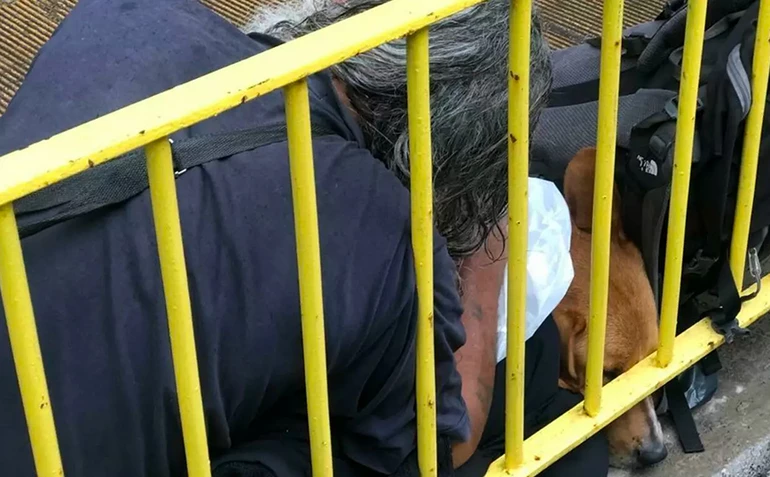 Ένας άστεγος στην Κρήτη αψήφησε τη βροχή και έβγαλε το μπουφάν του για να σκεπάσει το σκύλο του, ώστε να τον προστατεύσει από τα νερά.