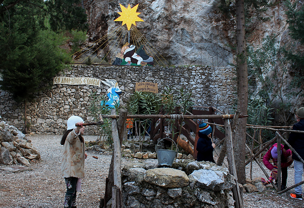 Οι Άγιες Μορφές Του Ιερού Βρέφους, Της  Μητρός Παρθένου Μαρίας και Του Αγίου Ιωσήφ, γιομίζουν το πανάρχαιο, αλώβητο και διαμπερές, λαξευμένο από τη φύση σπήλαιο, συντροφιά πάντα με αθώα και γλυκά προσωπάκια μικρών παιδιών, αναβιώνοντας το μέγα γεγονός Της Γέννησης.