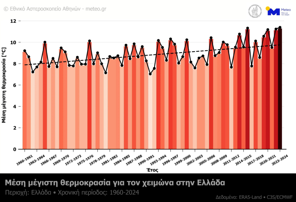 Στην Εικόνα 1 παρουσιάζεται η μέση μέγιστη θερμοκρασία για την περίοδο του χειμώνα από το 1960 μέχρι το 2024 στο σύνολο της Ελλάδας. Ο χειμώνας του 2023-2024 καταγράφεται ως ο θερμότερος στα χρονικά για την Ελλάδα, ξεπερνώντας τον χειμώνα του 2015-2016. Πολύ σημαντικό γεγονός είναι πως τα τελευταία 10 χρόνια έχουν καταγραφεί οι 6 θερμότεροι χειμώνες όλων των εποχών. Η μέση μέγιστη θερμοκρασία στην Ελλάδα από το 1960 μέχρι και το 2024 για την περίοδο του χειμώνα παρουσιάζει άνοδο κατά 1.8 °C.