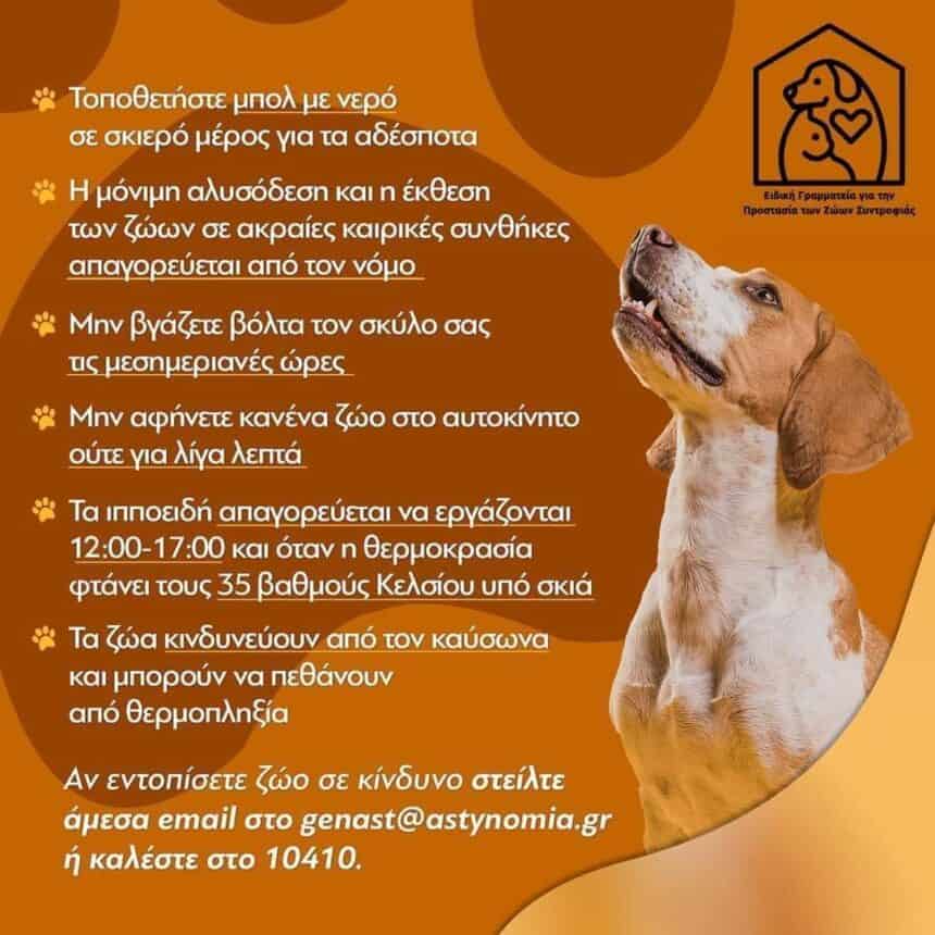 Οδηγίες προφύλαξης των κατοικιδίων και αδέσποτων ζώων από την Πανελλήνια Φιλοζωική Ομοσπονδία – Σε περίπτωση που κάποιος πολίτης αντιληφθεί ότι ένα ζώο υποφέρει, μπορεί να καλέσει την αστυνομία