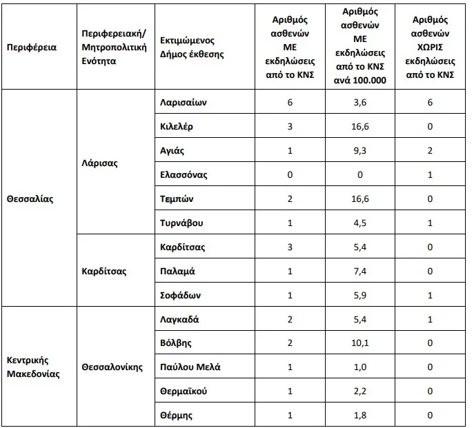 Ειδικότερα, από την αρχή της περιόδου 2024, μέχρι τις 14/08/2024 (ώρα 13.00), έχουν διαγνωστεί και διερευνηθεί συνολικά εβδομήντα έξι (76) εγχώρια κρούσματα λοίμωξης από τον ιό του Δυτικού Νείλου στην Ελλάδα, εκ των οποίων τα πενήντα επτά (57) κρούσματα παρουσίασαν εκδηλώσεις από το Κεντρικό Νευρικό Σύστημα (ΚΝΣ, εγκεφαλίτιδα ή/και μηνιγγίτιδα ή/και οξεία χαλαρή παράλυση) και δέκα εννιά (19) κρούσματα είχαν ήπιες εκδηλώσεις/ δεν είχαν εκδηλώσεις από το ΚΝΣ.