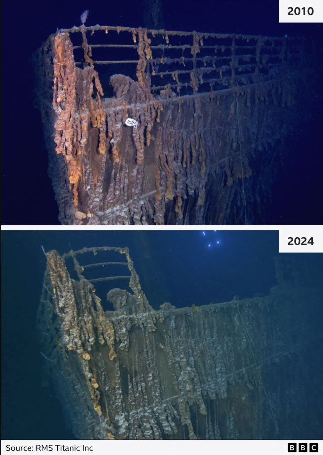 Μία νέα αποστολή στο ναυάγιο του Τιτανικού με υποβρύχια ρομπότ αυτό το καλοκαίρι αποκάλυψε τα αποτελέσματα της αργής διάβρωσης του μετάλλου και της αποσύνθεσης του πλοίου.